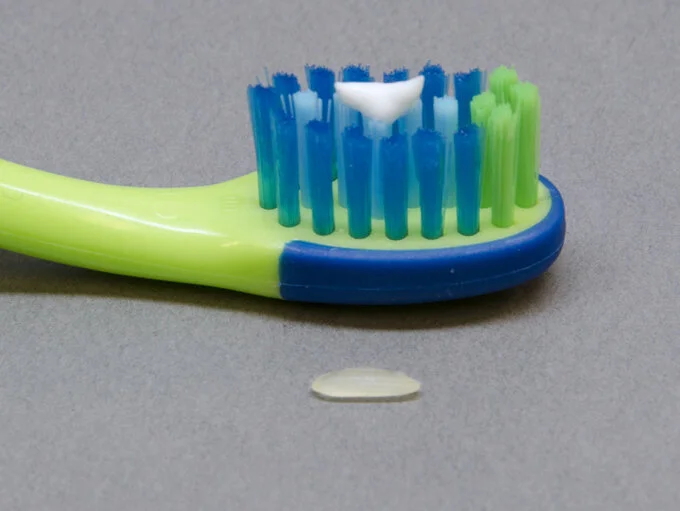 As soon as the first tooth appears, start brushing your baby's teeth twice a day (morning and night). Use a soft-bristled, child-sized toothbrush and a fluoride toothpaste. Until the child is three years old, use no more than a smear or grain-of-rice-sized amount of fluoride toothpaste. For children three to six years old, use no more than a pea-sized amount of fluoride toothpaste.